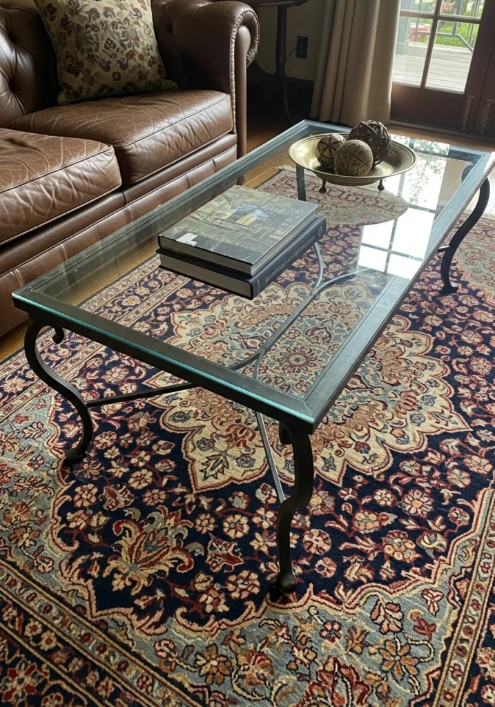 This rectangular beauty combines a clear glass inset with a slender dark metal frame that features delightful scrollwork. The legs are elegantly curved and taper down into small, delicate feet, providing a sturdy yet visually light presence in the room. Because the top is transparent, you can see the intricate patterns of the oriental rug beneath it, which adds so much depth to the seating area. It looks stunning alongside a leather Chesterfield sofa and is styled simply with a brass tray and a few meaningful books.