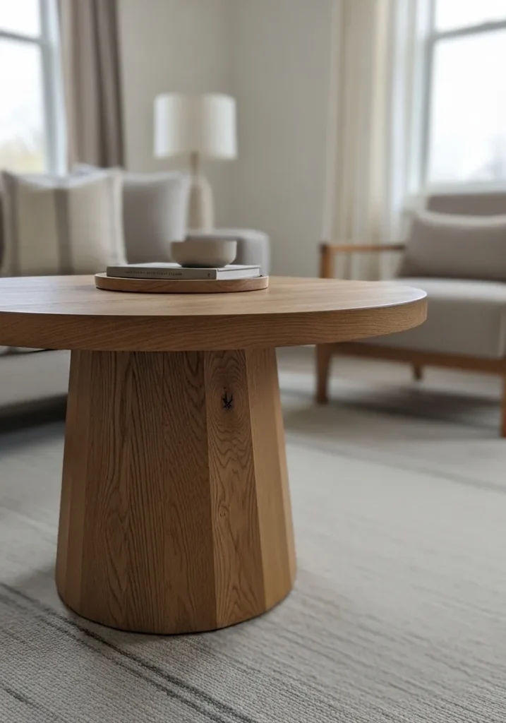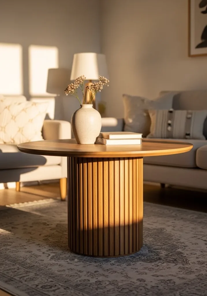 This design focuses on texture and geometry to create a warm yet contemporary focal point for a living room. The piece features a perfectly circular wooden top supported by a thick cylindrical base wrapped in vertical slats or fluting. This repetitive line work adds a beautiful rhythmic detail that catches the golden hour light and gives the furniture a soft architectural feel. Set on a faded vintage-style rug and surrounded by cream colored sofas, the natural oak tones bring an earthy and serene energy to the entire seating area.