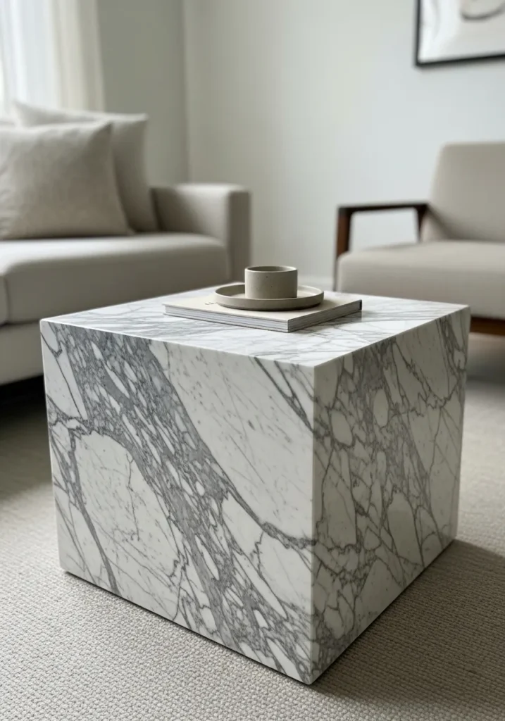 This piece is a masterclass in modern minimalism with its sharp geometric silhouette and luxurious stone finish. The table is a solid cube crafted from exquisite Carrara marble, featuring dramatic grey veining that snakes across the bright white surface. Its monolithic presence makes a powerful statement in a neutral room, providing a cool and polished contrast to soft upholstered furniture. Because it lacks traditional legs, the focus remains entirely on the natural beauty of the stone and its clean, crisp corners that give the space a very contemporary edge.