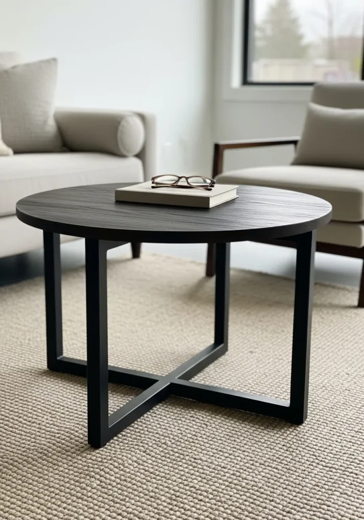 This modern design features a perfectly round top with a deep charcoal wood grain that feels both moody and incredibly sophisticated. The base is constructed from a bold black metal frame in a unique cross shape that provides excellent stability while keeping the look open and airy. It sits at a comfortable height for a lounge setting, and its dark finish offers a striking contrast against light neutral carpets and cream colored upholstery. The smooth surface is just the right size for a pair of reading glasses and your current favorite novel, which keeps the overall vibe very clean and intentional.