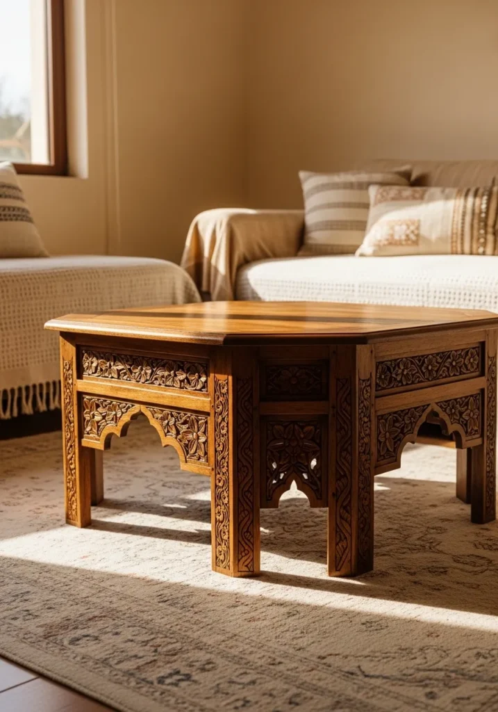 This stunning octagonal piece is a true celebration of artisanal craftsmanship and bohemian elegance. Each of the eight sides is adorned with intricate floral carvings and arched cutout details that cast beautiful shadows when the sunlight hits. The warm honey-toned wood has a soft glow that pairs perfectly with a relaxed living space full of layered textiles and neutral cushions. It sits sturdily on thick carved legs and offers a generous surface area for a tray of tea or your most treasured travel souvenirs.
