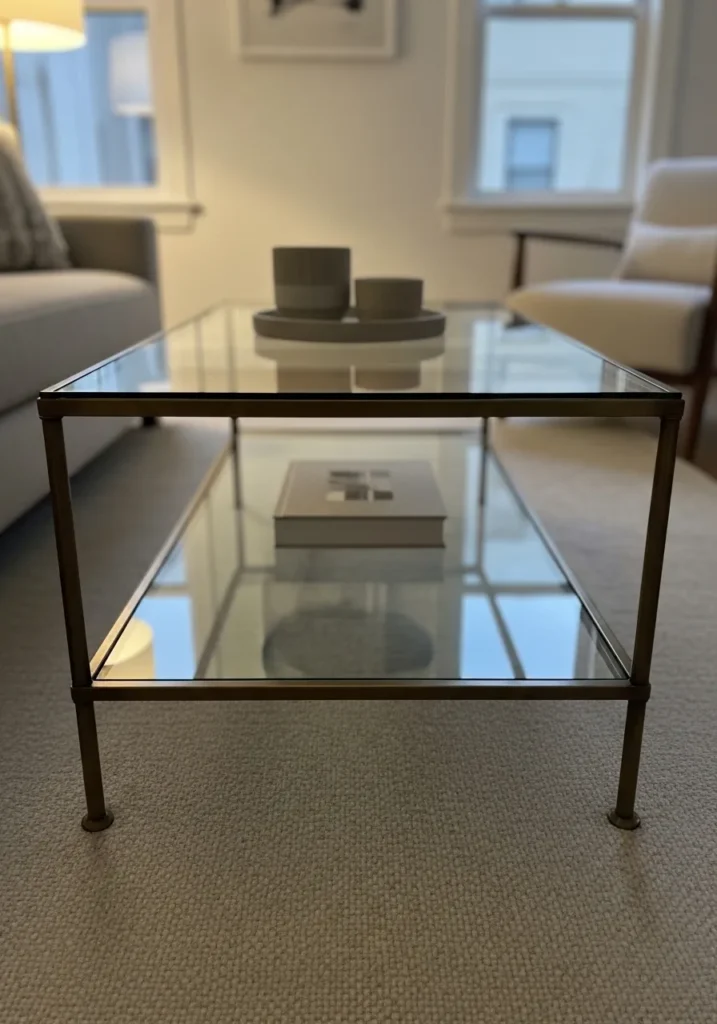 This sophisticated design features a dual-level glass surface held together by a slender antique brass frame. The transparent top and bottom shelves create an incredibly open and airy feel that keeps even the smallest living room from feeling cluttered. It stands on four delicate legs with subtle disc-like feet that offer a stable foundation without being bulky. Styled with minimalist grey ceramics and a curated art book, this table acts as a beautiful stage for your favorite decor while letting the surrounding neutral furniture and soft carpet take center stage.
