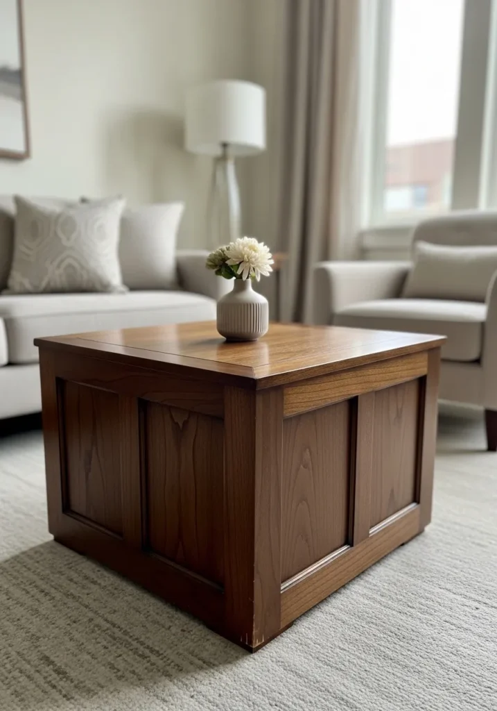 This substantial square design brings a sense of warmth and traditional craftsmanship to the center of the room with its rich walnut finish. The table features classic inset paneling on all sides and a clean-lined top surface that highlights the natural, flowing beauty of the wood grain. Its boxy, trunk-like silhouette provides a solid visual anchor in a bright living space, sitting perfectly atop a light grey textured rug. Styled simply with a small fluted vase and a single white bloom, it balances functionality with a polished, timeless aesthetic.