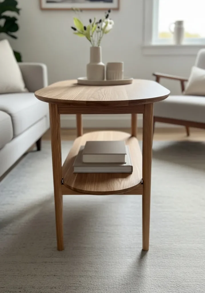 This design focuses on soft, rounded silhouettes and the light, airy quality of natural ash wood. The table features an oval top with a smooth, beveled edge, mirrored by a matching lower shelf that provides a perfect nook for stacking books or magazines. Supported by four slender, slightly tapered legs, the piece has a high-profile, delicate footprint that works beautifully in smaller living spaces. Styled with a matte ceramic tray and a sculptural bud vase, it sits harmoniously between plush neutral armchairs on a soft grey rug, creating a serene and inviting atmosphere.