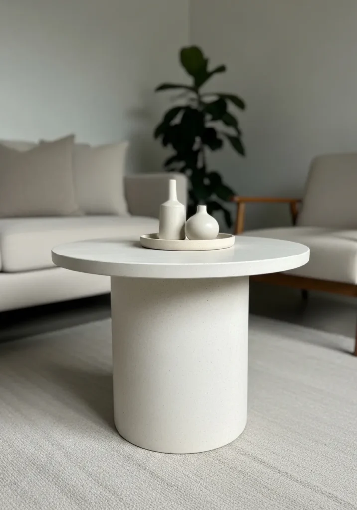 This final piece concludes the collection with a focus on seamless form and industrial-chic texture. The table features a perfectly circular top that transitions into a thick, cylindrical pillar base, all finished in a smooth, matte white concrete. Its monochromatic and monolithic look is incredibly striking against the light wood floors and soft grey tones of the surrounding lounge area. The subtle speckling in the concrete provides a touch of organic detail, ensuring the minimalist shape still feels tactile and grounded within the room.