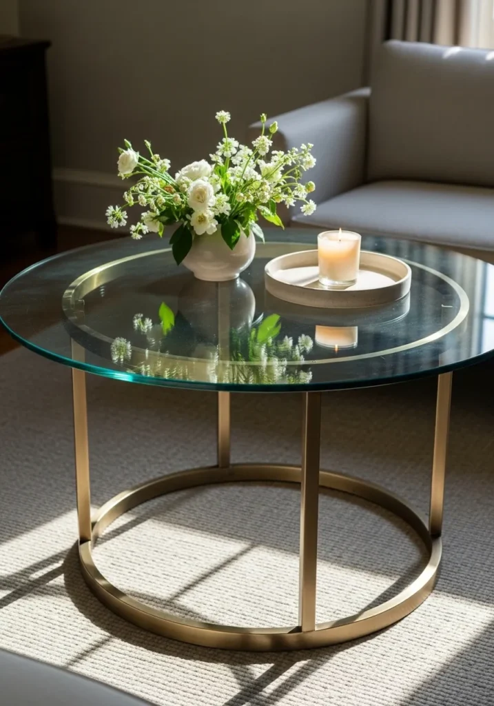 This design is a total dream for anyone who loves a bright and airy living space. The clear glass top allows light to flow through the room without any visual clutter, while the circular brass frame adds a subtle metallic shimmer that feels incredibly upscale. Its minimalist structure keeps the focus on your beautiful rug or floor but provides plenty of space for a stunning floral arrangement and a cozy candle. The way the sunlight catches the edges of the glass and the warm gold tones of the metal create a really inviting atmosphere that works with almost any color palette.