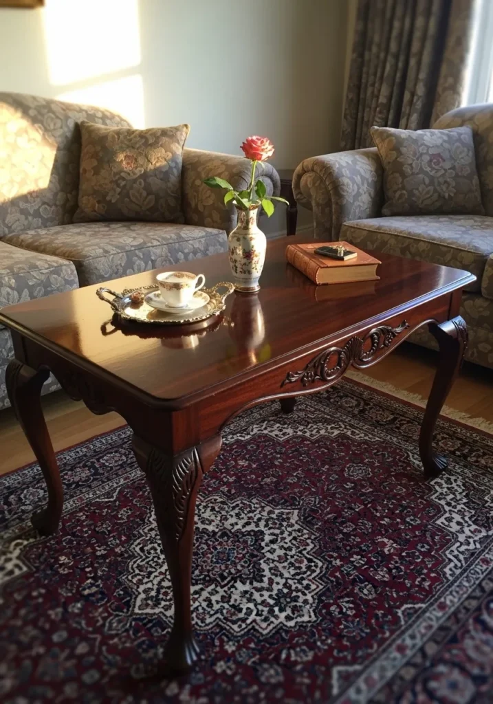 This stunning centerpiece features a deep reddish mahogany finish that gleams under the soft morning light. It boasts incredibly detailed hand-carved patterns along the apron and those iconic ball-and-claw feet that instantly elevate the room’s formal feel. The rectangular surface is polished to a high shine, providing the perfect backdrop for a delicate tea set or a vintage leather-bound book. Set atop a rich burgundy Persian rug and surrounded by plush floral upholstery, this table anchors the space with a sense of history and grandeur.