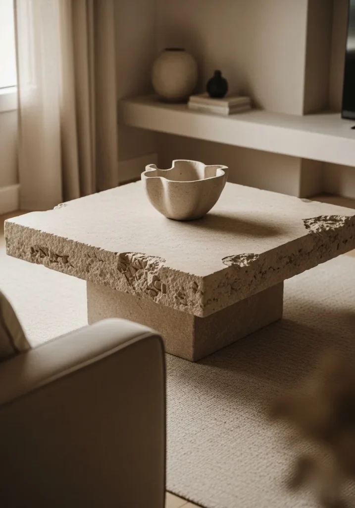 I admire how this table brings a bit of an ancient, museum-like vibe right into a cozy living room. If you’re a fan of the “minimalist but warm” look that is all over Pinterest right now, this is basically the gold standard. There is something so satisfying about the heavy, permanent feel of the stone paired with such a simple shape. It is the perfect spot to display a single artisanal bowl and a stack of linen-covered books for that effortless, curated aesthetic we all crave.