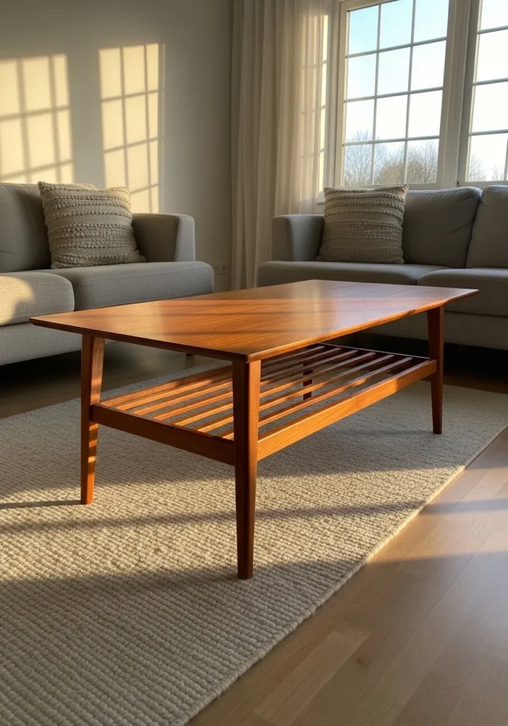 This sleek teak design brings a beautiful retro energy to a contemporary living room through its clean lines and warm amber tones. The rectangular top features a subtle sunburst grain pattern that catches the light streaming in from the window, while the tapered legs provide a light and airy footprint. What really stands out is the slatted lower shelf, which offers a perfect spot to tuck away remote controls or store extra reading material without cluttering the main surface. It sits beautifully on a ribbed cream rug and anchors the seating area between two plush grey sofas.