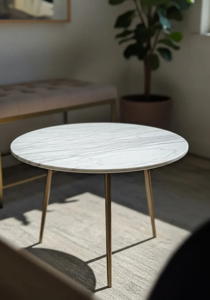 This design focuses on clean lines and high-quality materials to create a look that is both modern and incredibly chic. The thin circular top is crafted from white marble with delicate grey veining that adds just the right amount of visual interest without being too busy. It is supported by slender tapered gold legs that give the table a lightweight and airy feel, making it an ideal choice for smaller apartments or cozy reading nooks. Set against a backdrop of neutral tones and natural greenery, this piece brings a touch of effortless glamour to a quiet corner.