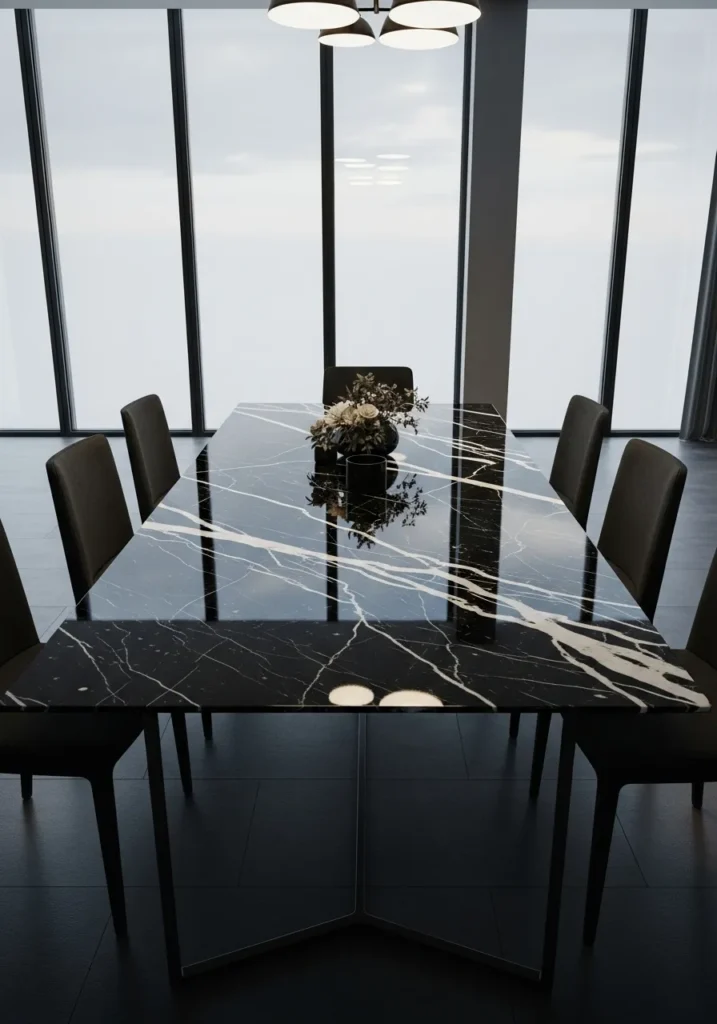 This design showcases a dark marble dining table with subtle veining and a smooth matte finish. The table is styled with elegant place settings and simple florals, creating a refined and intimate atmosphere. Slim chairs and soft daylight keep the look balanced and modern.