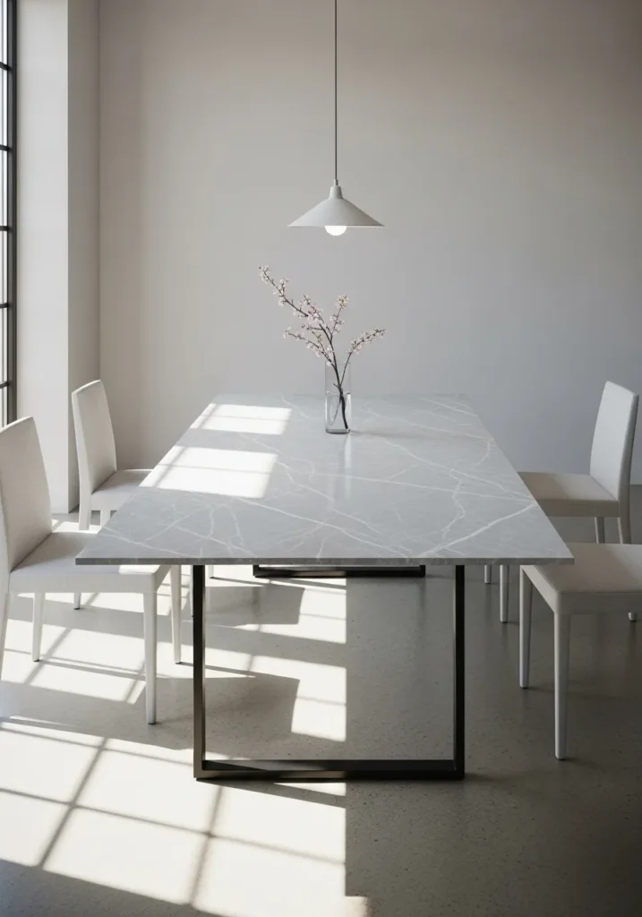 This design highlights a clean white marble dining table with soft veining and a sleek black base. Paired with minimal white chairs and simple pendant lighting, the whole room feels bright and uncluttered. Sunlight streaming across the table adds gentle shadows and depth.