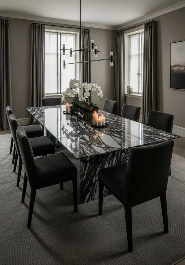 Here we see a glossy dark marble dining table paired with dark upholstered chairs and layered lighting. The marble surface reflects the room softly, adding depth and elegance. Curtains and decor in muted tones keep the space feeling cohesive and refined.