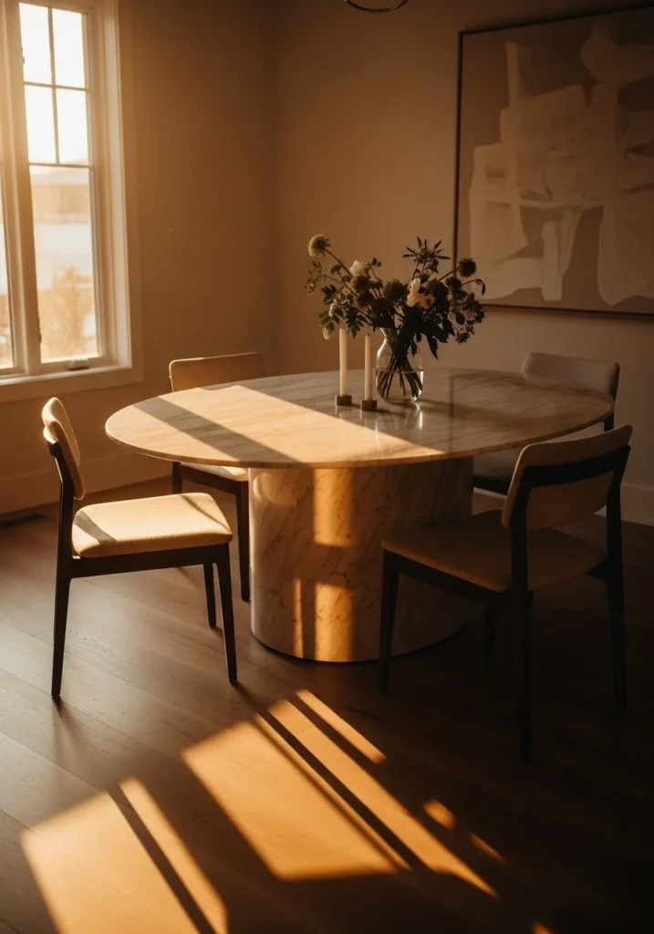 This dining space features a light marble table with a sculptural base, placed perfectly in warm afternoon sunlight. The golden glow highlights the natural veining in the marble and casts beautiful shadows across the floor. Simple chairs and minimal styling let the light do most of the work.