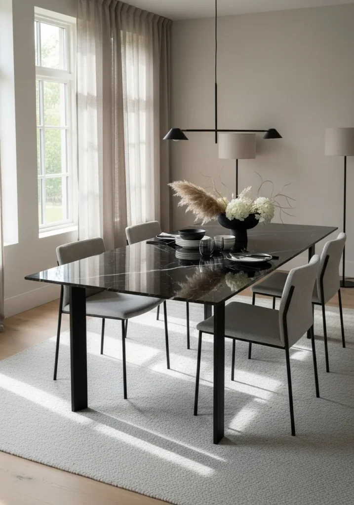 This design showcases a glossy black marble dining table with clean lines and a minimal base. Neutral upholstered chairs and a simple pendant light keep the look sharp and contemporary. Light curtains soften the space and prevent the darker marble from feeling too heavy.