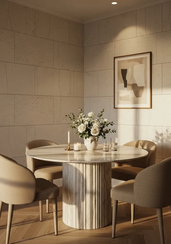Here we see a round marble dining table with soft veining and a fluted pedestal base that adds visual interest. The curved chairs echo the shape of the table, creating a cozy and cohesive look. Warm tones and layered textures make the space feel welcoming.
