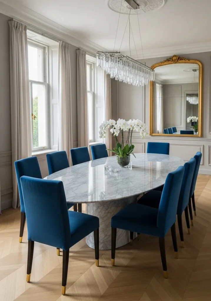 This dining room centers around a long marble table paired with rich blue upholstered chairs. The marble surface feels timeless, while the deep color of the chairs adds personality and contrast. Tall windows and soft curtains bring in light and keep the space airy.