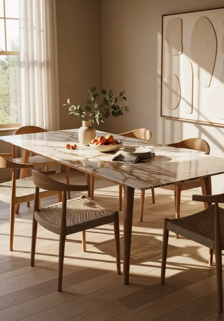 Sunlit Marble Dining Table With Natural Wood Chairs