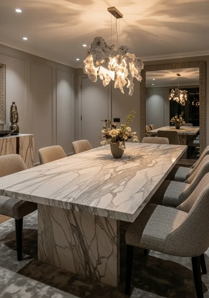 This dining room features a long marble table with dramatic veining and a solid sculptural base. Soft upholstered chairs surround the table, and a statement chandelier casts a warm glow across the surface. The neutral palette and layered lighting give the space a luxurious and polished feel.