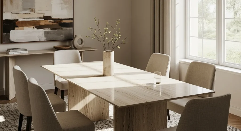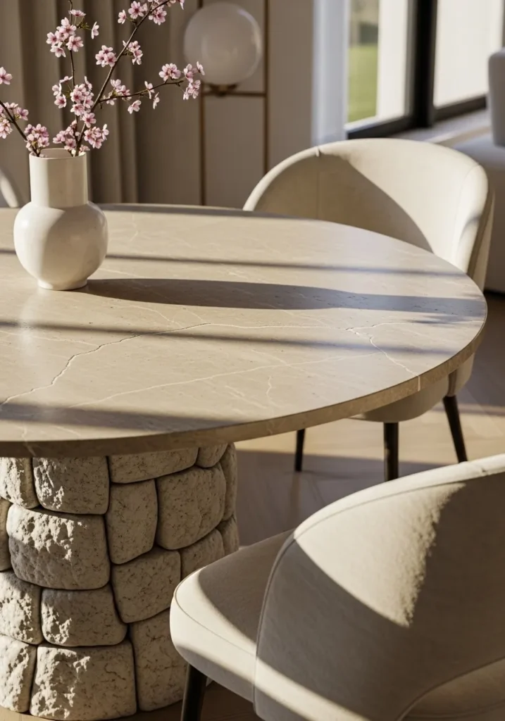 This round marble dining table sits on a chunky stone base that adds texture and weight in the best way. The soft beige marble top pairs beautifully with upholstered chairs in warm neutral tones. Natural light highlights the subtle patterns in the stone and gives the whole space a calm and grounded feeling.