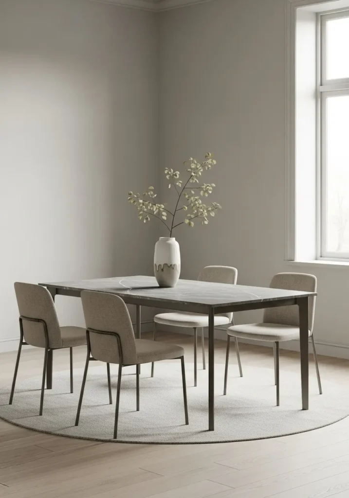 Here we have a clean lined marble dining table placed in a light filled room with very little visual noise. The chairs are simple and modern, and the soft gray marble top blends effortlessly into the neutral color palette. The result is a space that feels open, airy, and easy to live with.