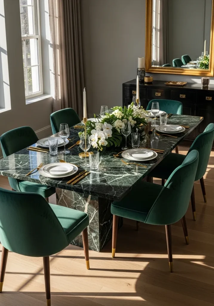 This dining setup features a deep toned marble table combined with plush green velvet chairs. The marble surface has a moody elegance, while the greenery and table styling add warmth and personality. Natural light softens the darker elements and keeps the room from feeling heavy.