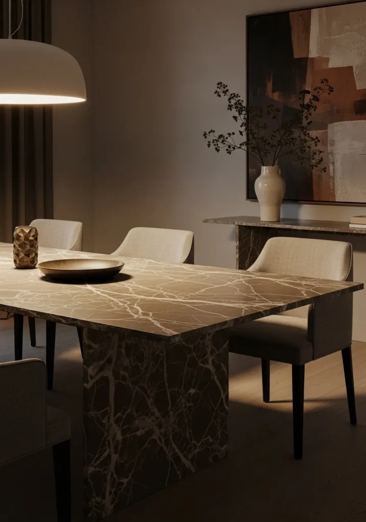 This rectangular marble dining table has bold veining and a solid sculptural base that immediately draws the eye. The darker tones are paired with simple chairs and soft lighting, creating an intimate and slightly dramatic atmosphere. Minimal decor keeps the focus on the marble itself.