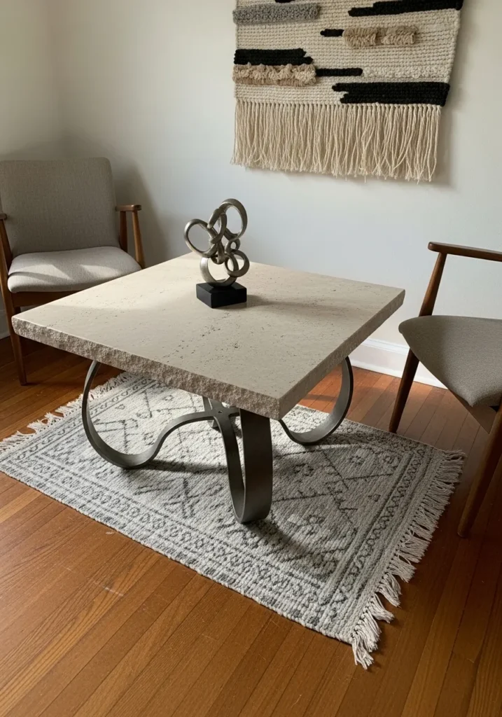 This cozy living nook centers around a square stone coffee table with a wonderfully textured, chiseled edge that feels incredibly tactile. The creamy beige top is supported by four bold, ribbon-like metal legs that curve inward, creating a striking sculptural silhouette against the warm hardwood floors. A silver interlocking knot sculpture sits on top, mirroring the fluid movement of the base, while a small tasseled rug underneath adds a layer of bohemian charm. The neutral armchairs and the shaggy woven wall hanging complete this serene, desert-inspired aesthetic.
