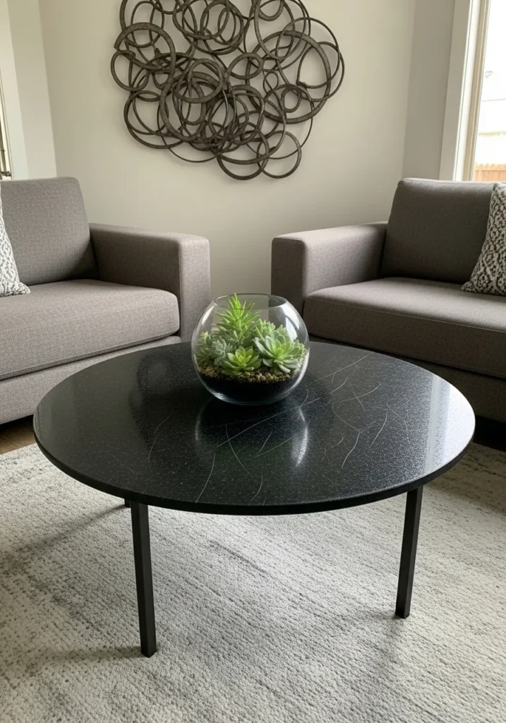 This chic arrangement centers on a perfectly circular coffee table topped with a glossy black stone that features faint, wispy white veining. The dark, reflective surface creates a sophisticated focal point against the light gray textured rug and the matching charcoal armchairs. A glass terrarium bowl filled with vibrant green succulents sits right in the middle, providing a pop of life and organic color that breaks up the monochromatic palette. In the background, a large metal wall sculpture made of interlocking wire circles echoes the table’s round shape, tying the entire modern look together.