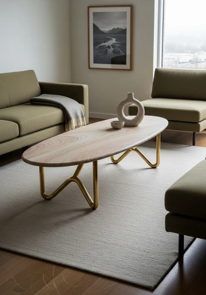 This living space is anchored by a gorgeous oval table made from a light sandstone that features incredible swirling grain patterns reminiscent of desert dunes. The stone slab is supported by unique, sculptural brass legs that branch out in a V-shape, adding a touch of mid-century flair to the room. Positioned between two moss green sofas, the table holds a donut-shaped ceramic vase that echoes the organic curves of the furniture. A soft, oatmeal-colored rug provides a neutral foundation, while a minimalist landscape photograph on the wall brings a sense of the outdoors into this serene environment.