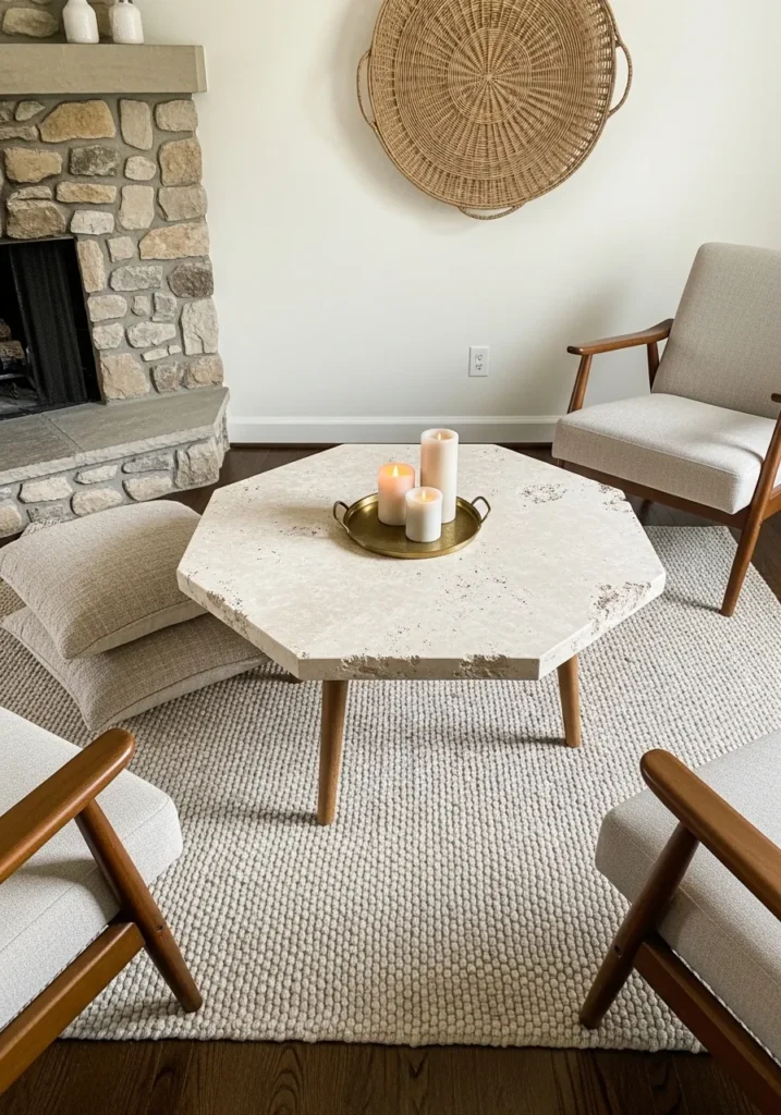 This living area features a unique eight-sided coffee table carved from a creamy, porous travertine stone that looks incredibly sturdy. The top boasts a raw, pitted texture along the edges, giving it a weathered and authentic feel that pairs beautifully with the stone fireplace in the background. It rests on simple, tapered wooden legs that provide a light, mid-century modern lift to the heavy stone slab. A golden tray with a trio of glowing white candles sits in the center, casting a warm light across the nubby wool rug and the surrounding linen armchairs.
