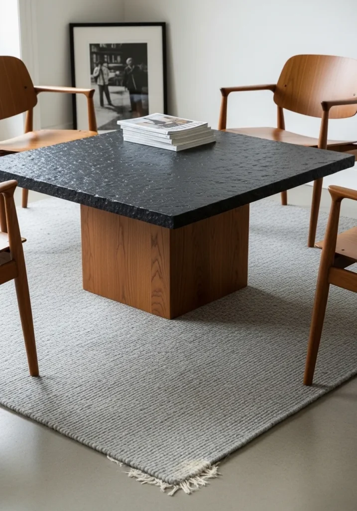 This room features a bold square coffee table that serves as a massive focal point against a ribbed gray area rug. The thick black stone top has a distinct hammered texture that catches the light in such a cool way, especially when contrasted with the smooth, warm wood of the block pedestal base. Surrounding the table are sleek teak armchairs with tapered legs that keep the space feeling open and airy. It is a fantastic example of how to mix heavy masculine materials with delicate vintage-inspired furniture for a perfectly balanced look.