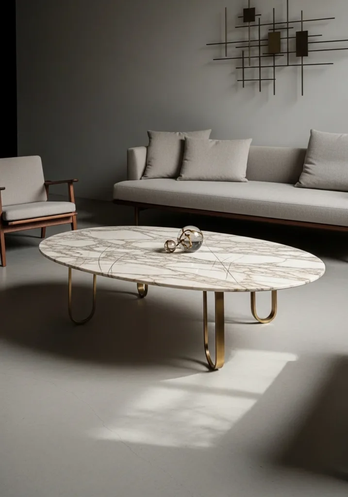 This sophisticated living area centers around a large oval marble table that boasts intricate brown and gray veining across a creamy white surface. The stone is supported by unique U-shaped brass legs that provide a light and airy feeling despite the substantial weight of the marble top. Set against a backdrop of minimalist gray seating and a sleek wall sculpture, this setup highlights how metallic accents can instantly elevate natural stone. The play of light on the polished surface creates a sense of movement that keeps the neutral palette from feeling flat.