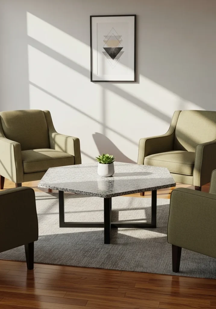This airy lounge area is defined by a striking hexagonal coffee table that shows off a speckled white and gray terrazzo surface. The six-sided stone top provides a playful geometric break from the traditional square or round shapes we usually see in living rooms. It is supported by a minimalist black metal cross base that keeps the visual weight low and allows the light from the large window to flow across the warm hardwood floors. Paired with soft sage green armchairs and a simple framed art piece, this design feels fresh and intentionally curated.