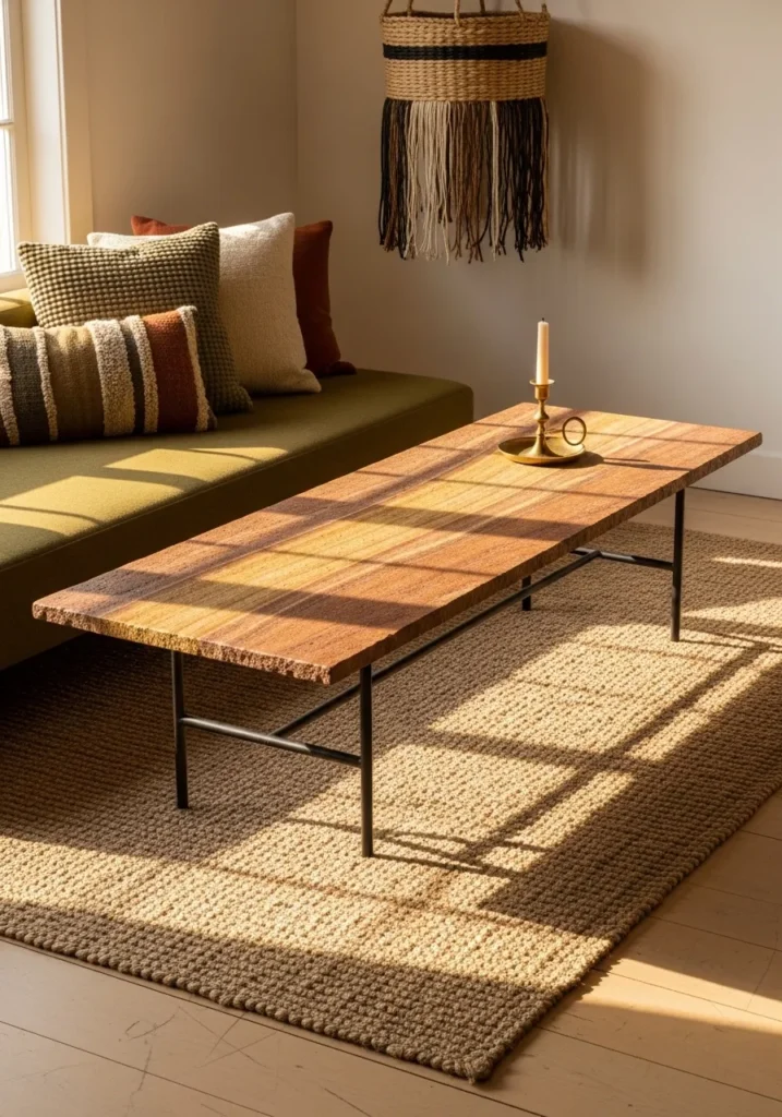 This setup features a long rectangular table made from a stunning reddish-brown stone that mimics the warm glow of a canyon wall. The slab is defined by its ruggedly textured perimeter, which adds a raw and unpolished element to the sleek olive green daybed sitting behind it. Supporting the heavy top are slender dark metal frames that provide a clean and industrial contrast to the organic weight of the stone. A chunky knit rug and a multi-toned tassel wall hanging further enhance the global and handcrafted feel of the entire nook.