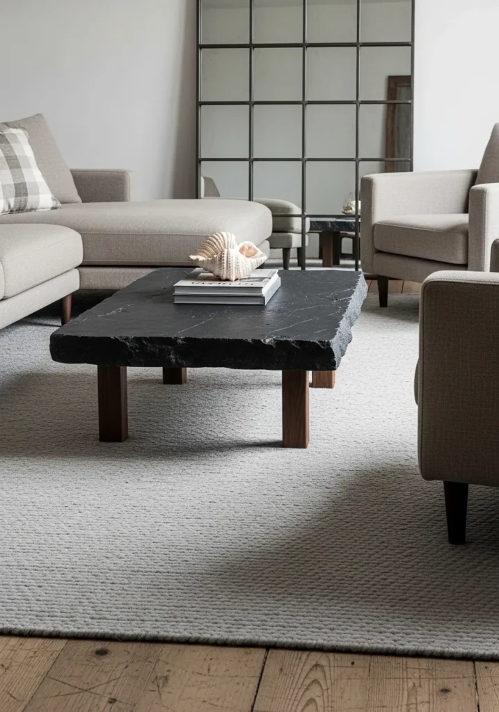This living room brings together a massive slab of dark charcoal slate and warm wooden legs for a look that feels incredibly sturdy. The stone top boasts a naturally jagged perimeter that gives it a hand-hewn artisanal quality, while the deep black color provides a sharp contrast against the light gray textured carpeting. Atop the table sits a large white decorative seashell resting on a stack of books, creating a subtle coastal nod within an otherwise modern industrial setting. A large gridded window mirror in the background reflects the soft neutral tones of the sectional and armchairs, making the entire space feel bright and expansive.