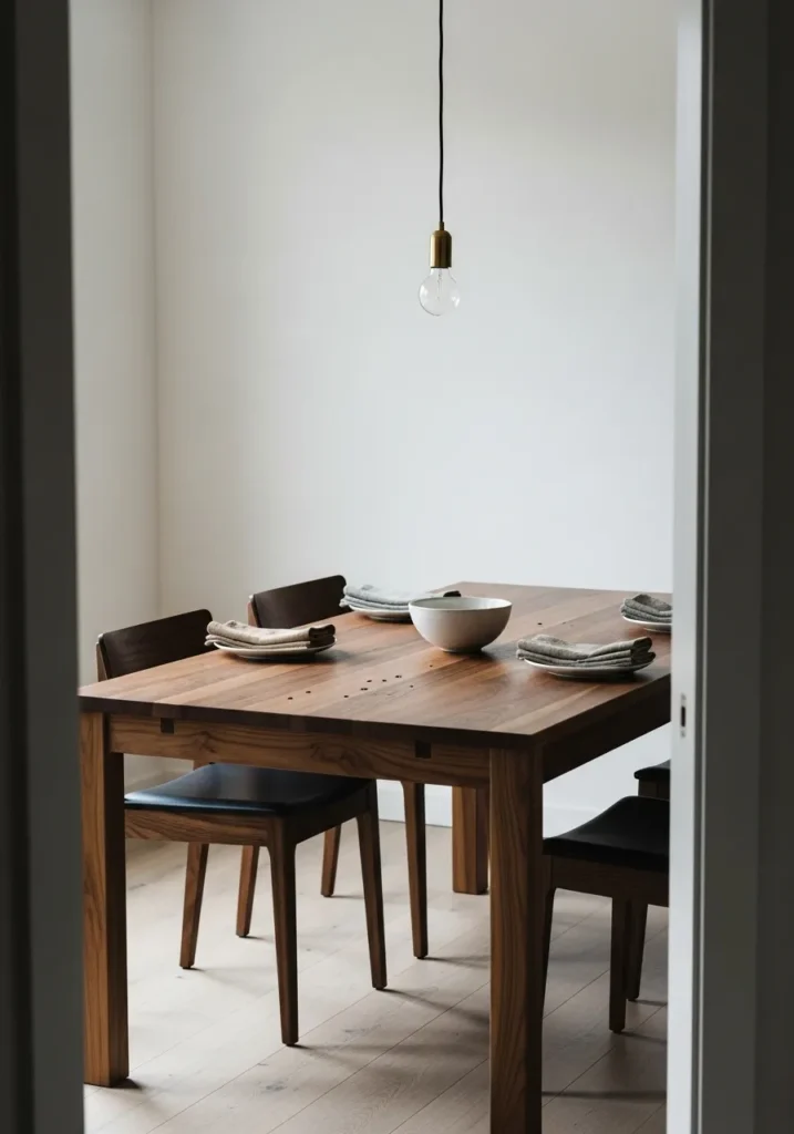 This dining setup keeps things calm and intentional with a solid wood table, simple chairs, and very little visual noise. The warm tones of the wood add depth without feeling heavy, while the clean walls and subtle lighting keep the space feeling open and relaxed. Everything feels placed with care, but nothing feels precious or untouchable.