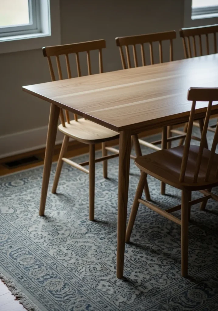 This setup pairs a traditional wood dining table with a patterned rug that adds warmth and structure. The chairs feel sturdy and familiar, while the rug helps define the dining area and makes the space feel more finished. It is a great balance between practical and cozy.