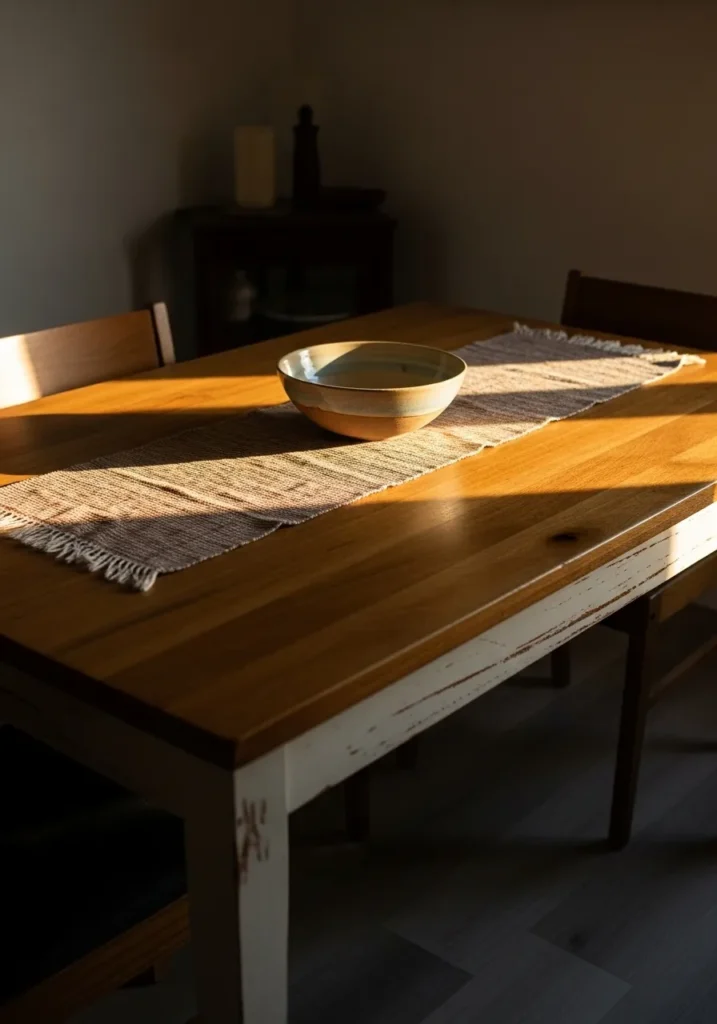 This dining table combines a warm wood surface with slightly contrasting legs, giving it a bit of visual interest while still feeling grounded. A simple runner and bowl keep the styling minimal, letting the table itself shine. The lighting adds depth and makes the wood grain feel rich and textured.