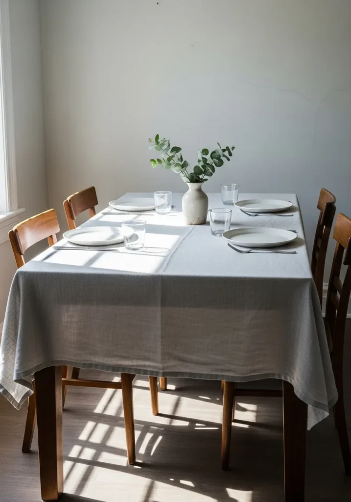 This dining table is styled with a tablecloth and minimal place settings that create a relaxed and welcoming mood. The light fabric softens the look, while the wooden chairs keep the space grounded. Sunlight filtering in adds a quiet warmth that ties everything together.