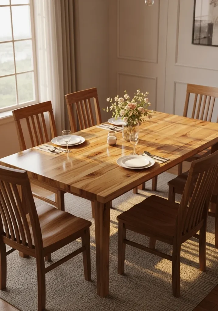 This dining table feels rooted and familiar with its solid wood surface and traditional chairs. Soft daylight fills the room and highlights the natural grain, while the simple table setting keeps everything relaxed and approachable. It feels balanced and thoughtful without looking styled for show.