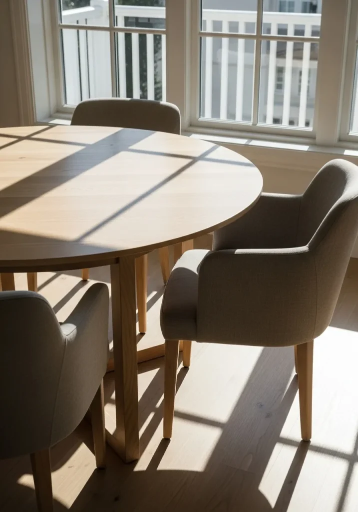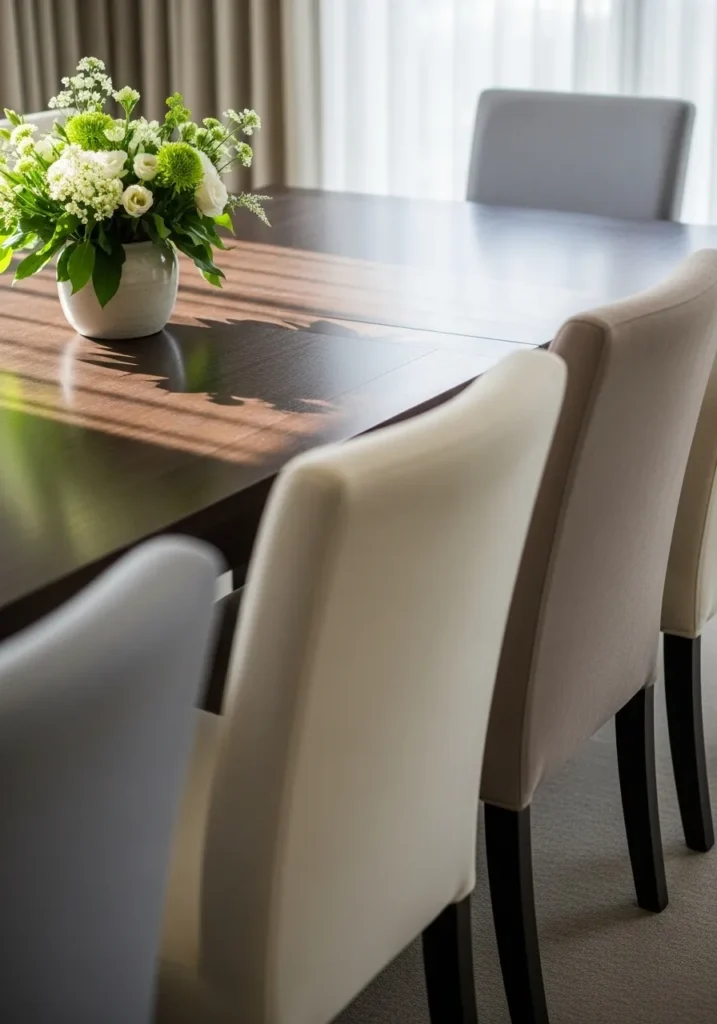 A smooth wood dining table pairs beautifully with upholstered chairs in soft neutral tones. The contrast between the sleek tabletop and the plush seating adds depth without cluttering the look. Natural light from the windows highlights the clean lines and keeps the space feeling fresh and airy.