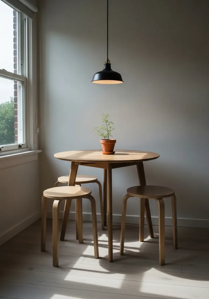 This compact round table fits perfectly into the corner of the room and makes the most of the natural light from the window. The matching stools and simple pendant light create a calm and cohesive look that feels intentional without being busy. Every element has a purpose, and nothing feels extra.