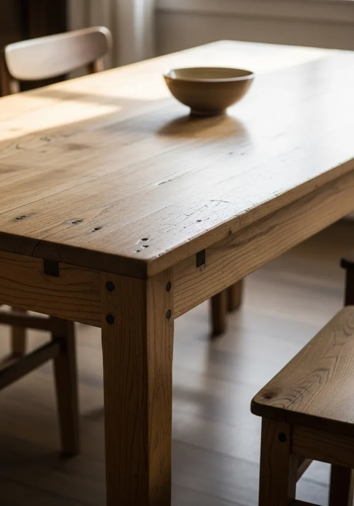 This table stands out because of its sturdy build and visible wood details. The clean surface and simple bowl centerpiece let the craftsmanship speak for itself. Natural light brings out the texture and makes the table feel honest and grounded.