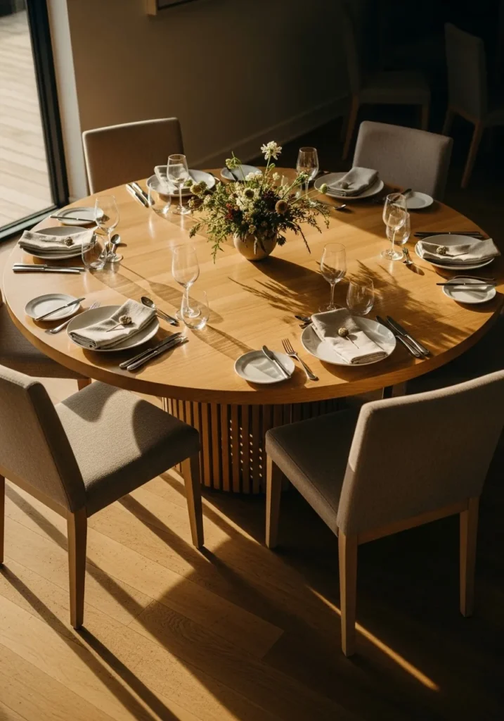 This round dining table is styled for connection, with place settings arranged closely and warm light filling the space. The shape naturally pulls everyone together and creates an inviting atmosphere that feels perfect for shared meals. The overall look is cozy and intentional without being heavy.