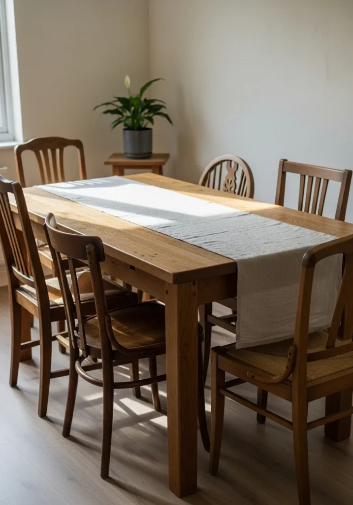 This dining table feels calm and well balanced, with solid wood tones that instantly warm up the room. The neutral runner adds a soft layer without covering the natural grain, and the mix of classic wooden chairs gives the setup a relaxed, collected look. Clean walls and natural light keep the space feeling open and uncluttered, letting the table quietly take center stage.