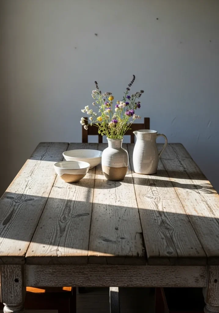 This dining table leans into a slightly rustic look with a weathered wood surface and simple ceramic pieces layered on top. The texture of the table adds character, while the neutral color palette keeps it from feeling too farmhouse heavy. The small floral arrangement adds just enough life without stealing the spotlight.