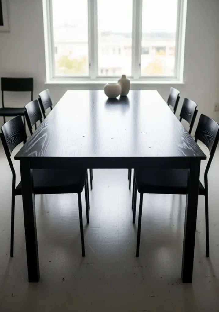 A long black dining table brings a strong visual anchor to this bright room. The clean lines and simple chairs keep the look modern, while the natural light prevents it from feeling too serious. A minimal centerpiece adds interest without breaking the calm flow of the space.