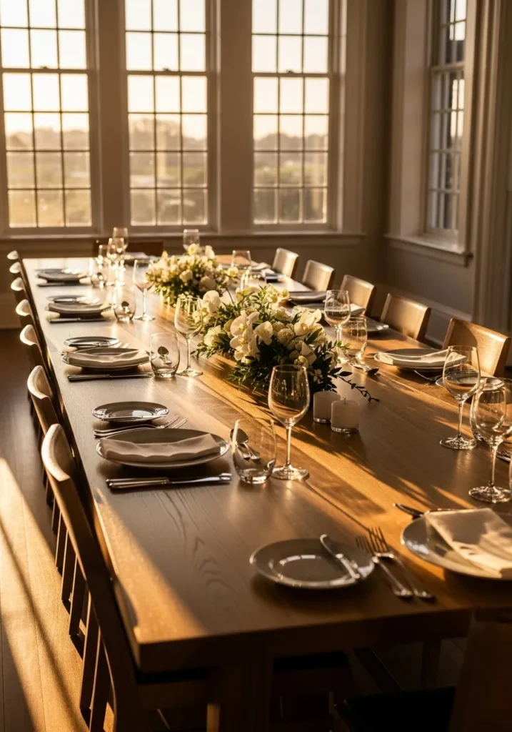 This dining table stretches confidently through the room and feels made for hosting. The warm wood surface glows in the late afternoon light, while the long runner and simple place settings keep everything grounded and calm. Tall windows frame the space and let the sunlight do most of the styling, which makes the whole setup feel natural and effortless.