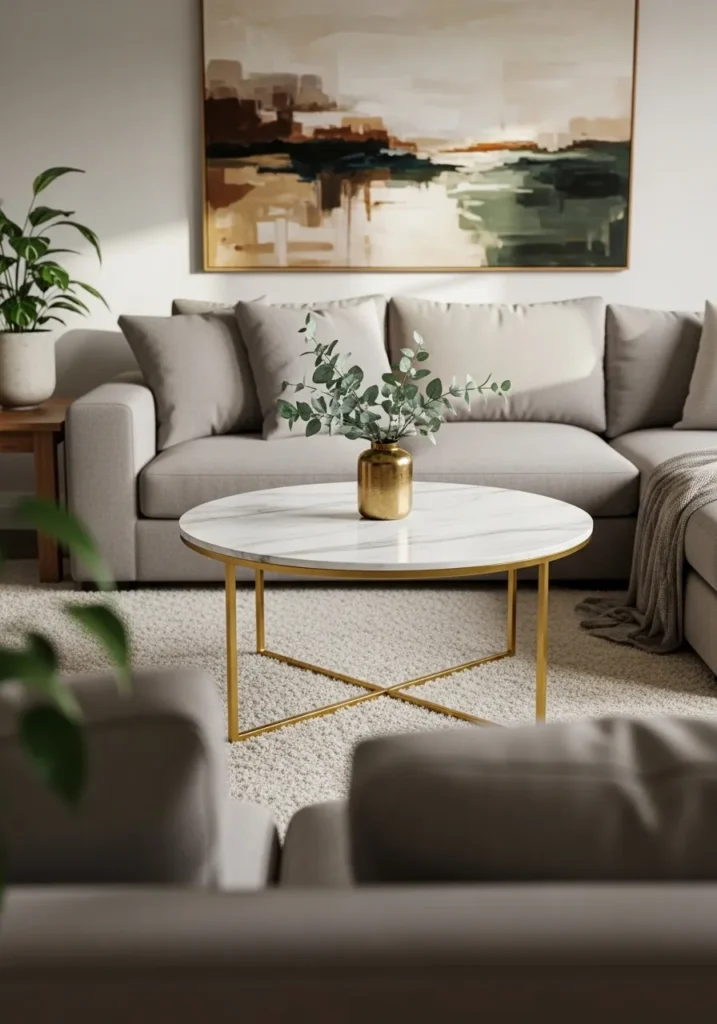 This living room layout highlights a beautiful mix of soft textures and metallic finishes. The neutral sectional sofa provides a cozy foundation, while the large abstract painting adds a sophisticated, earthy vibe to the back wall. Natural light hits the plush white rug and makes the white marble tabletop with its delicate grey veining look incredibly bright. The thin gold legs of the circular table bring in a touch of luxury that balances out the more relaxed elements like the green potted plants and the simple gold vase.